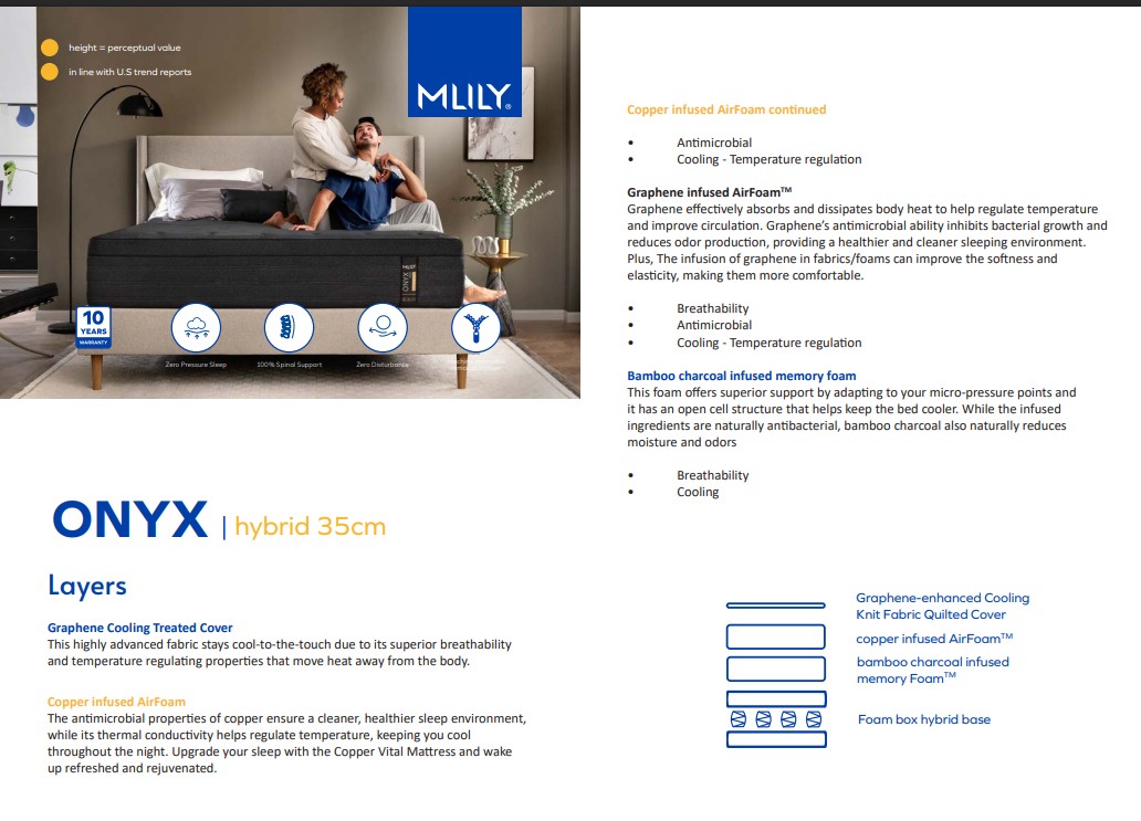 Stay cool and supported with the Mlily Onyx Hybrid Mattress featuring Copper Gel AeroFusion™ Memory Foam, Graphene & Liquid Gel Flex Foam.
